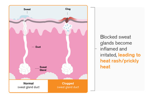 It’s caused by sweat glands in the skin becoming blocked. This stops the sweat from escaping the body. Instead, it leaks into nearby skin, causing redness and rashes.